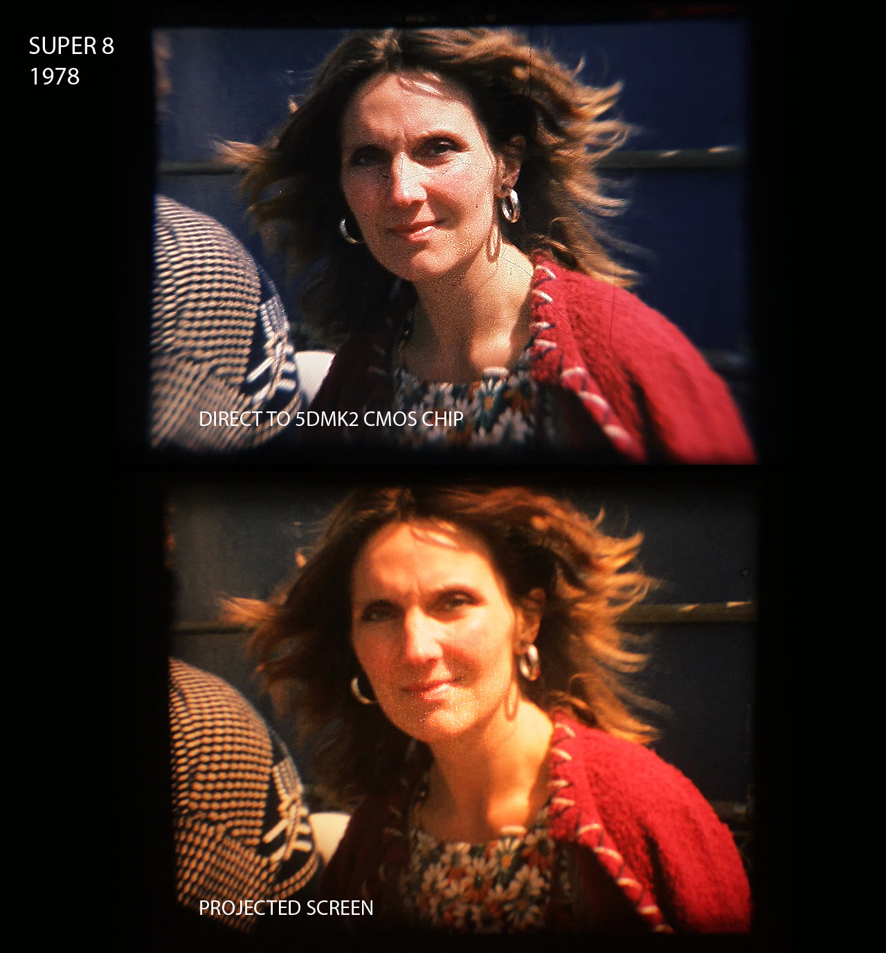 Unless the projector's gate is allowing the film to curl (which I doubt) it looks as if the fast projection lens doesn't have a very flat field. The design intent was (in 1973) to put as much light onto the centre of the screen as possible, and pretty much all else was side-stepped to get this result. I use a Schneider Xenovaron f/1.1 zoom in my Elmo GS1200. It has a wonderfully flat field and is noticeably better than Elmo's f/1.0. Can uoi use a macro lens on the 5D to photograph the frame directly in the projector's gate and bypass the projection lens? There are some fascinating pages here on building your own machine out of an old Eumig projector: Construction of a home made Telecine machine tom. |