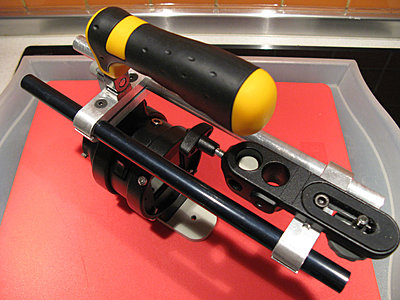 So, first please everybody who is intrested in this setup take a good look at this pictures because it will be much easier to explain how to build this. There is couple of parts that has to be done at CNC shop and this is mayor problem for DIY this setup, but you can always buy your self a rail system that already has that part and save a lot time. 15mm rods are solid aluminum bars from my metal depot wholesale and 3m cost around 25$. They are heavy but very rigid. This is usualy second problem. Thats why I recommend to buy something like this: ebay seller:dvaccessory or try here http://www.emachineshop.com/ They have exellent free CAD drawing software, so you can order things for you or find how much cost something without even asking them. Their software you can also use for other stuff... They are not cheap for one or two parts but for 10-20pc are ok. You can also try to find localy a shop that can do this couple of things for you. (Even big guys doo that...) Ask them to do only hard machining part, holes and threads and painting you can do yourself. Clamp for 15mm rods like mine without fine finishing and without holes and threads cost around 15$/pc in a shop where I do my stuff. Please don't ask me to do this for you. If there is enough interest I will post plans with measures for rod clamp without threads. Last edited by Igor Babic; April 2nd, 2008 at 02:16 AM. |