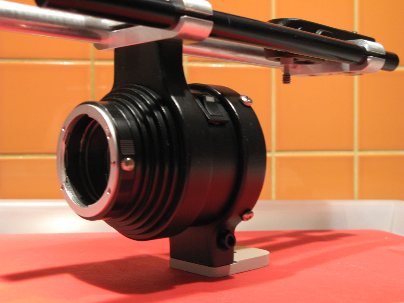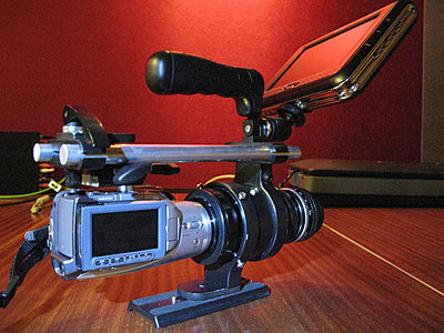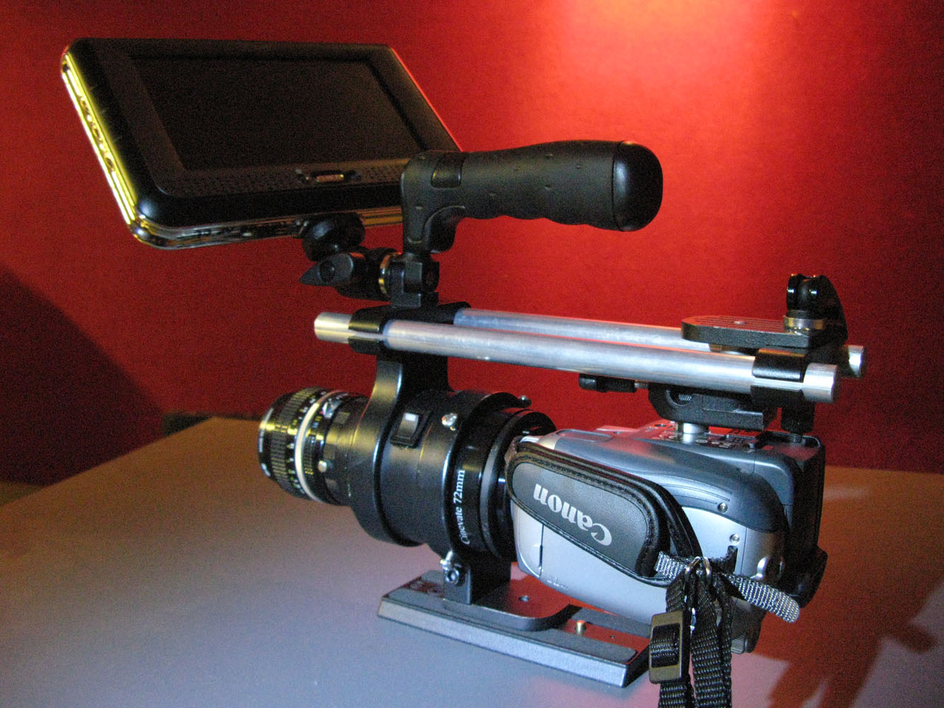 It will be my silver HV20...for now. Most of my setup is made from parts that are available for cheap on ebay. Some of them you have to adopt, and some are made in CNC and laser cutter shops. But you must be handy with various simple machining tools (and you must have easy acces to them or own them from other projects to justify investment) to do this kind of setup. PS I just love smell of fresh paint early in the morning... I have also add Manfrotto 482 ball head for monitor mount. Looks great. Entire setup weights around 2.5 kg, including Nikon 85mm/f2.0, HV20 and achromat. |