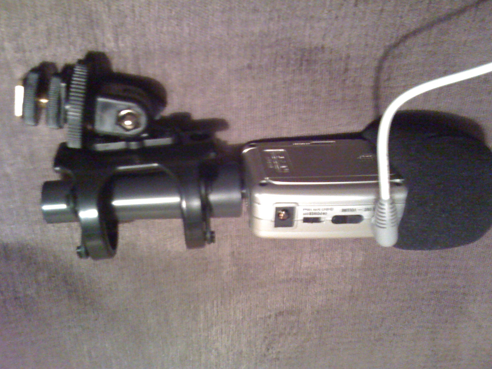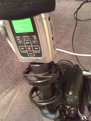 I also have a Zoom H4n which is used for separate audio recording, but that's getting a bit big for camera mounting. Still, I'll experiment with both. After actually getting my hands on a Rode NT4 today, I saw what I knew already really - it's just too big and heavy. Thanks for the input. EDIT: OK I tried fitting on the Zoom H2 with a Rode SM3 shockmount plus bits from a Rycote Hotshoe Extender. It looks rather awkward but is quite light and it gives a choice of 90 or 120º stereo settings by selecting front or rear mics, rotating the H2 if necessary. I haven't done a test recording yet but I would need to find the optimal settings to reduce noise on the camera audio tracks. I'm using the line out on the H2 and the mic in on the HV-30, not the ideal match. Of course a recording from the H2 could just be synced on later, but it would be good if I could avoid having to start and stop both Zoom and camera every time. Here's some photos (apologies - just from an iPhone) The last one shows details of the mounting. Last edited by Colin McDonald; November 14th, 2010 at 04:39 AM. |