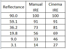 The attached chart below shows the resulting IRE levels of the six gray squares for each mode. It is apparent that Cinema allocates lot more IRE range/space for shadows with under 3% reflectance.