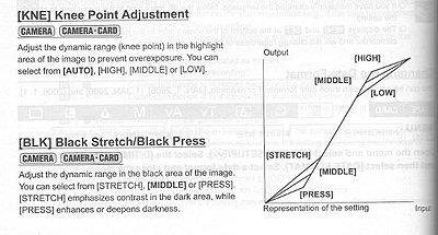 Here is how Canon describes it in the XHA1 manual. Black, knee and gamma all interact. As to why the banding it is more apparent in Laptops, I suspect that in the interest of saving power they try do things in the least processing intensive way, and use displays that draw less power. The additional processing to do a full 8-bit or dithering is not necessary for most purposes, so they save a bit of power by doing 7- or 6-bit and skip on the dithereing. Then banding can become apparent under certain image circumstances. Changing drivers and/or firmware may adjust this, but at a power consumption cost. I wonder if just uninstalling the drive did not effect it because the drive installation may have included a firmware update. I know that happens with the BlackMagic Design Intensity cards.
