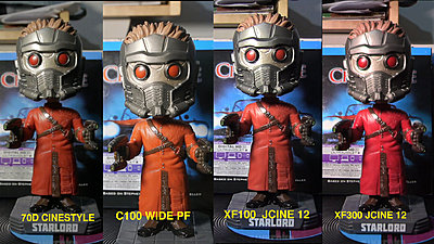 Since I have several presets loaded into each camera I did some testings to see which ones would match or get close enough to do some adjustments in post...nothing major. I shots the same scene -some slight framing differences but same lighting conditions-I white balanced and the cameras were close in K temperature. from 3700K to 3900K- so close enough. For the 70D i manually entered 3700k to match the readings of the C100. Then I just asked my good pal Starlord to pose for me and he did :-) . I found that the C100 mk2 looks great using Wide DR, the 70D ok in cinestyle but too soft so I will use a modified faithful setting instead with some adjustments-less contrast, then the XF100 in the Truvid 2 preset I found several months ago (thanks!) and the XF300 also in the Truvid2 setting. JPEG is attached.. I found that the only one that shows a shift to the reds is the XF300 which I have noticed before but I have lived with it I guess but I want to change that...exactly which settings do I need to tweak to bring the colour of the XF300 more in line with the XF100 and the rest. I should have asked this question years ago! I hope someone can guide me here guys...thanks! pls help! Erick