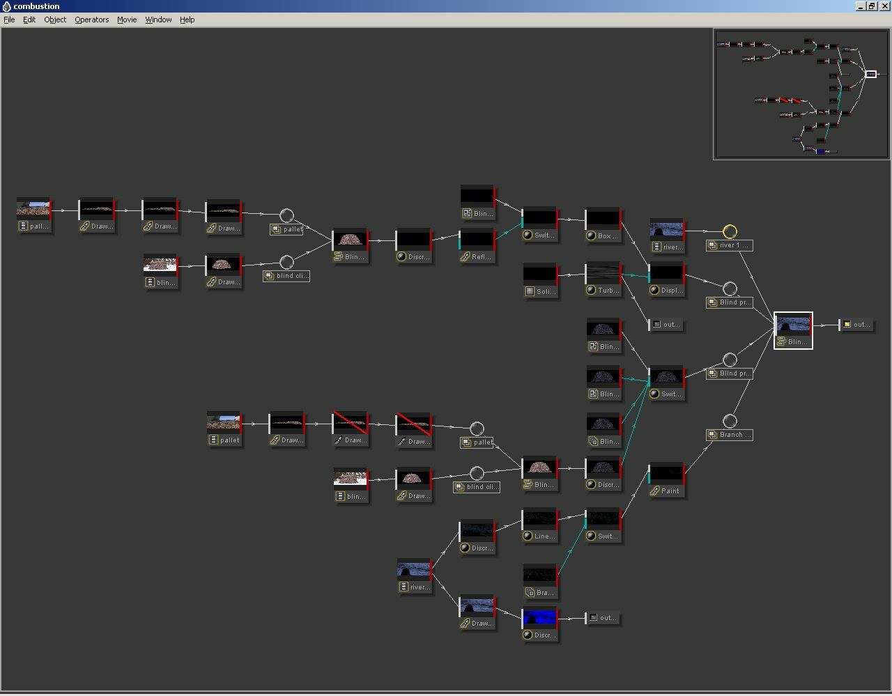 Speaking of which, I feel I owe a few credits for my end of the effects, namely the following: Avisynth, the frameserving application Donald Graft, for his DGMPGDec Avisynth plugin Pismo Technic, and their File Mount System and last but not least, Joe Lowe's Avisynth Virtual File System I don't want to clutter the thread with details, but the stuff I did--amateur as it may be--would not have been possible without all of that software. The procedure was a variation on what I detail in this thread from the 5D Mark II forum, with extraneous bits of info in a similar discussion, only with the extra steps of rendering an uncompressed Targa sequence, then bringing it into Avid Liquid to render my final HDV2 format MPEG files. Easier to set up and use than it sounds. Attached, interested parties will find a screengrab of the schematic view from the most complicated shot's combustion workspace. You can bet I ended up making this far more intricate than a real professional would have, but whatever works. I did end up learning a lot doing this, so thank you for the practice, Lorinda! |