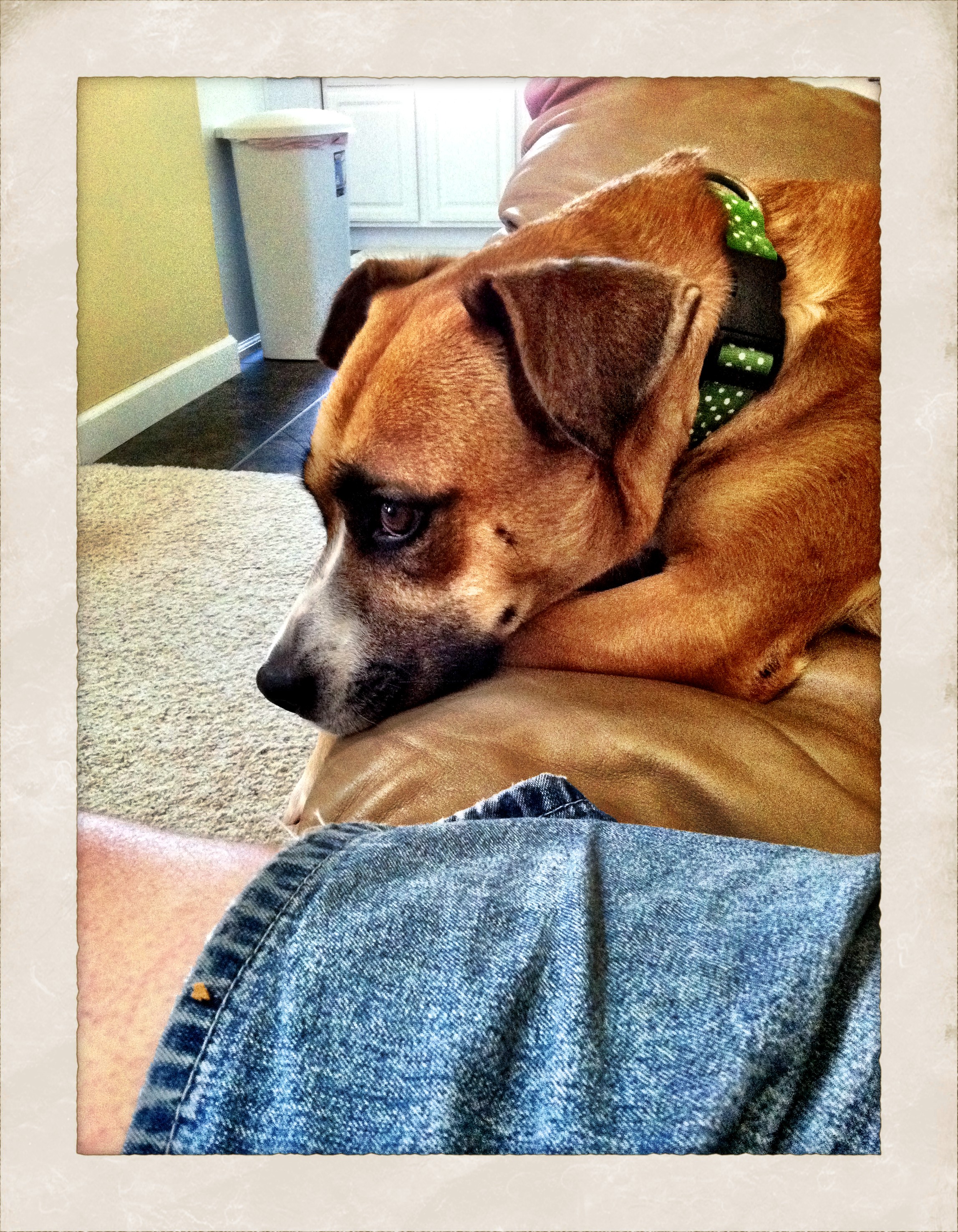 Bella after I worked with her for several months. And Bella chilling with me on the couch at home while I was on vacation and my dogs were at daycare.