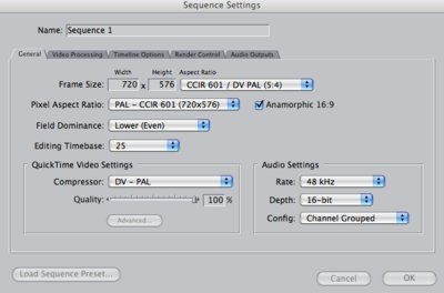 Note that the operation to get proper interlacing cannot be achieved in FCP. You can interlace in FCP however you actually get two fields derived from every second frame. The solution is that you either use DVCPRO50 or Appleprores in Compressor and set it as follows Format: QT Width: 720 Height: 576 Pixel aspect ratio: PAL CCIR 601 (16:9) Crop: (L: 0, T: 0, R: 0, B: 3) Padding: None Frame rate: 25 Frame Controls On: Retiming: (Fast) Nearest Frame Resize Filter: Nearest Pixel Deinterlace Filter: Fast (Line Averaging) Adaptive Details: On Antialias: 0 Detail Level: 0 Field Output: Top Field First Codec Type: Apple ProRes 422 Multi-pass: Off, frame reorder: Off Interlaced (top field first) Pixel depth: 24 Spatial quality: 50 Min. Spatial quality: 0 Temporal quality: 0 Min. temporal quality: 0 Apply a sharpening filter -setting about 7-9 Please note that the frame controls must be on and set with the interlacing set to upper or lower field first depending whether you use DVCpro50 or Prores. Please note that even better results can be obtained by using more stringent methods of downscaling, however the render time can become horrendous. The issue that causes the rippling that was described in a previous post is caused be uneven scaling of HD interlaced material, the only way around that is to shoot in 50P or deinterlace to 50P before you downscale. There are a few other ways of dealing with this issue but they rely on purchase of software. Of course another way is just shoot on a high quality SD professional broadcast camera.I don't believe anything can beat that option. As has been suggested, this is a complex topic haunted by the perception that middle of the range HD camera's can deliver better SD results after downscaling than shooting with the best SD camera's( which is in my experience not true). regards Ian Skurrie |