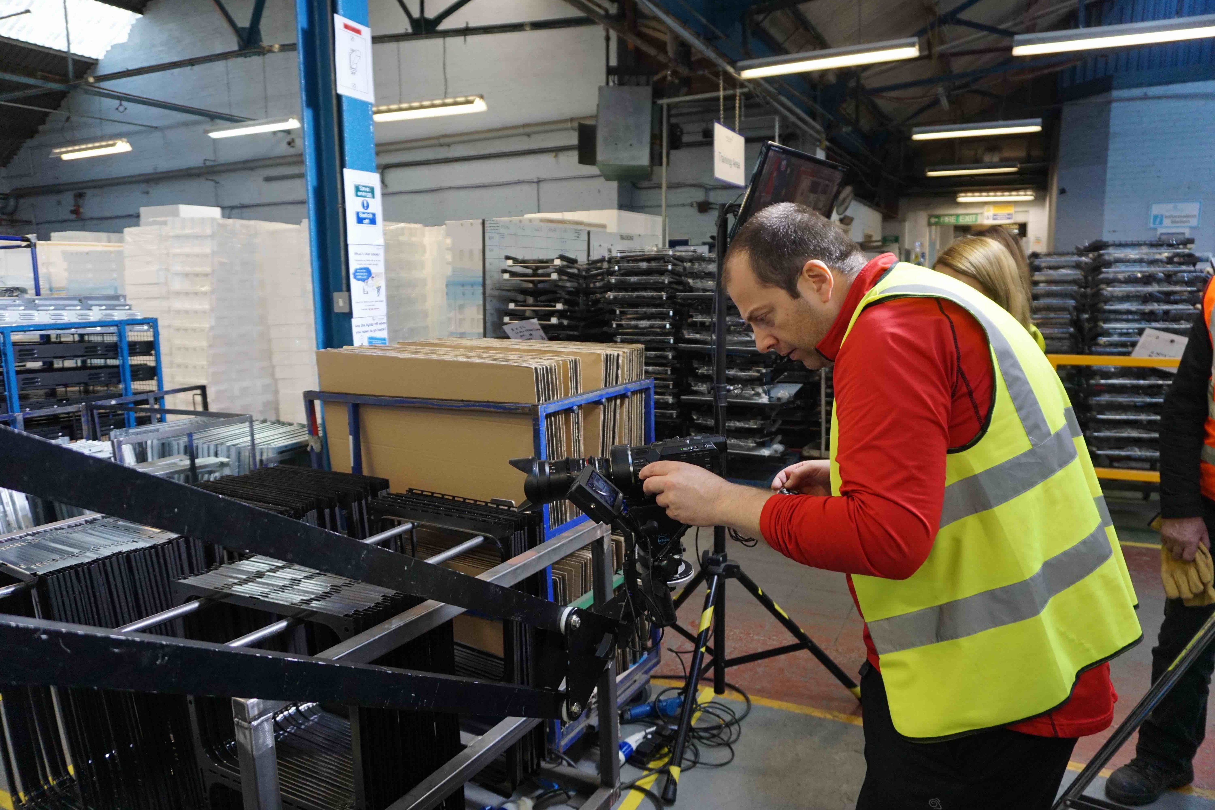There's wasn't much of a brief for this job, so I went on a quick recce and the client's only real concern was that we had to keep disruption to a minimum. The production line switched to making our specific colour and design when we needed to start filming, and we only had the parts to produce five of our ovens, so I had to film it as fast as I could. There was some daylight in the factory as well as fluorescents and some other nasty discharge lighting. But the strong key lighting in the video is from a 1.25kw and a 2.5kw Arri MSR. Hiring the 2.5 was probably overkill on my part and AFAIK it was dimmed throughout as well as heavy diffused. Next time I'll just hire 2x 1.25kW instead. I filmed it all using my trusty Hague Multi-Jib on a Heavy Duty Manfrotto tripod, and that's on a Vinten tripod dolly so I can wheel it around the location on my own if I need to. The client were watching my 22 inch location monitor via wireless HDMI. I always joke with my assistant about lens choices, because although I own a set of five Samyang t1.5's I mostly seem to just use the 35mm. I used the 85mm for the shots of the team and I think the 50mm was in there for one or two shots as well. In FCPX I used the 'Epic' look from Luster Grade on an adjustment layer. And I've done a few colour corrections under the adjustment layer to balance between shots. The file on YouTube is a quick export at 720p, but the proper 1080p image is clean and sharp.