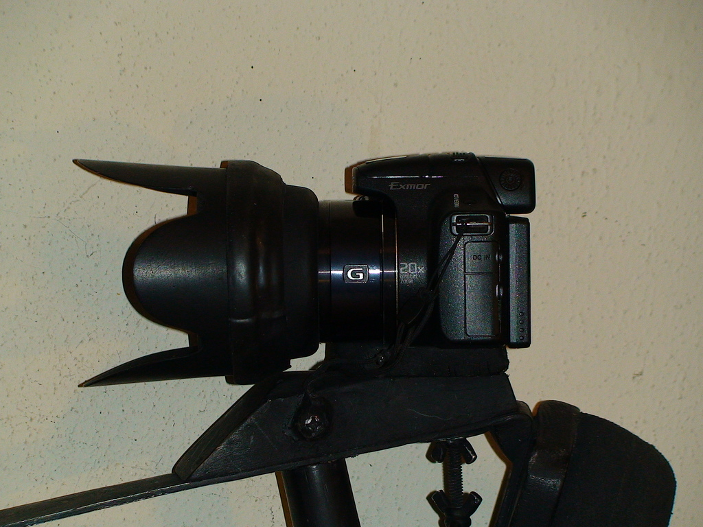 The 720p video of the HX1, uses an encoding rate that is 18% lower, on a bit-per-pixel basis, than the 1080p video. I've also found that the Photo-mode settings of the HX1, such as Sharpness, Contrast and Color-Saturation, seem to have a significant effect on the video, as well. I tested it today, with those settings in the high position and also turned on the low level of DRO for the first time. The video looked richer and sharper after I'd made those changes. Attached are photos of my new steady-mount rig for the HX1. It has a 57mm to 74mm fiberglass lens adaptor tube I made and a fiberglass butterfly hood. Sony doesn't supply an adaptor tube with the HX1, that provides for the mounting of filters, hoods and add-on lenses, which I can do with this set-up. On my Flickr album, there's several more photos of other accessories I mount on the HX1 with my adaptors. I also have an adaptor that's 57mm to 58mm. I've made a couple of similar adaptors for the Canon SX1/SX10, that are mounted by slipping the base of the adaptor over the outside of the lens housing, with some stretched wraps of self-fusing rubber sealing tape underneath, to compress and hold it firmly. I've already mounted one as a test on my Canon S5 camera and it works fine. There's a picture of this several pages back into my Flickr album. The SX1/SX10 have no threads nor a bayonet mount on their lenses, that are suitable for mounting heavy add-on lenses. The Lensmate company does sell an adaptor for them, that allows filters to be mounted. It's said by a lens-accessory dealer, that soon, some after-market HX1 adaptor tubes will be available and I'll report it here, if I find where they are sold.