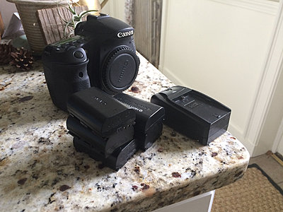 I'm including 5 batteries: 3 LP-E6 (Canon) and 2 High Voltage (generic) and a Pearstone charger. The camera has light wear. The grip peeled slightly at the top after 6 months but has not gotten worse since then. $400 including shipping.