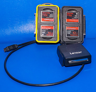 Lexar CF FW800 card reader and four Sandisk Extreme 32GB 60MB/s UDMA 400x cards in a Ruggard case.