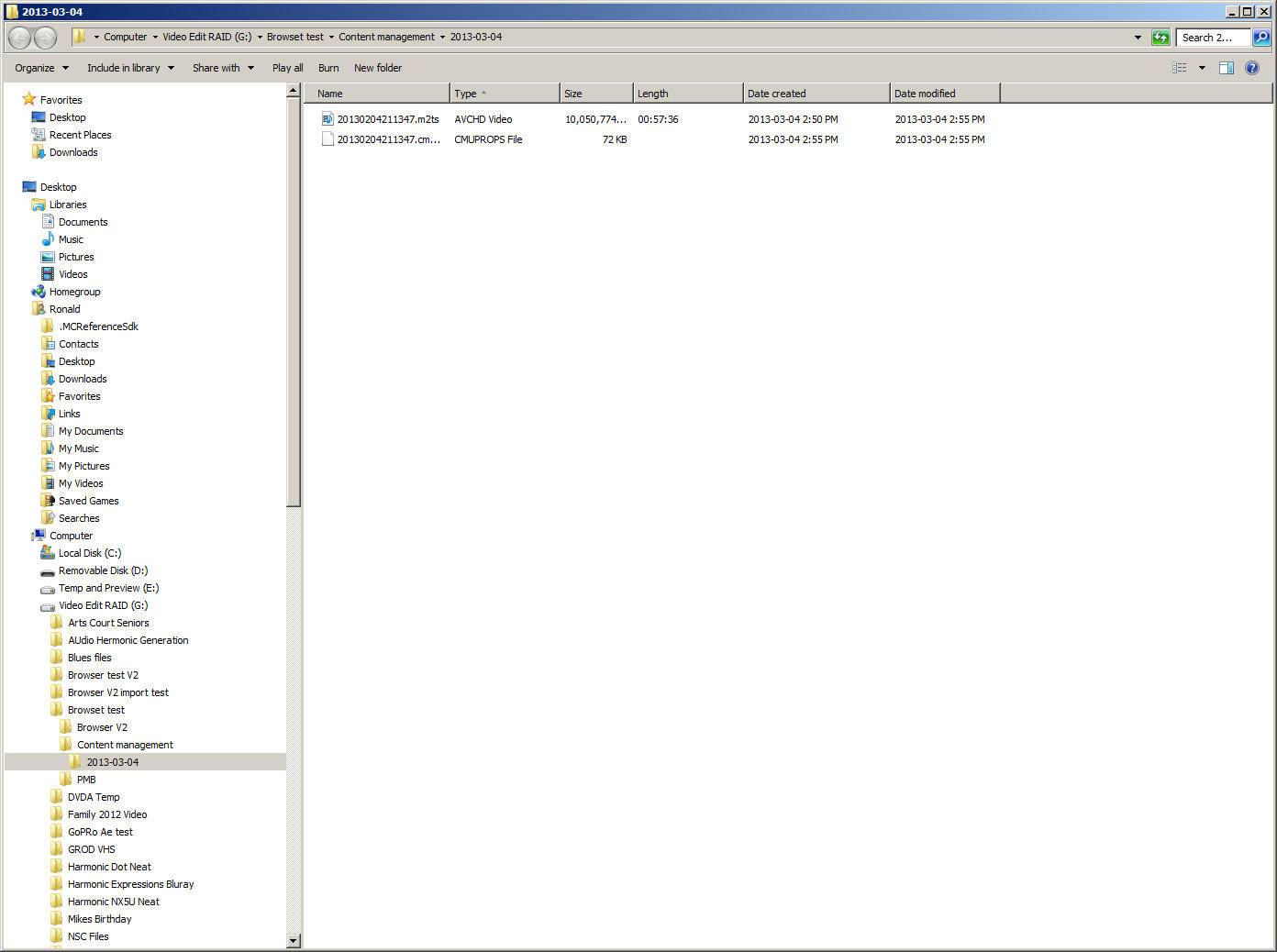 Your "registered folder" shows the correct file made up from the 5 split files... It's 57 mins long so that's all correct as far as I can see. Why can't you simply pull that mt2s file into your NLE and plonk it on the timeline??? That's what I'm doing and have no issues ..I don't really care what the Explorer Window is showing at all. All I need to do to keep my stuff together now is copy the merged file from the registered folder into my client's folder so all my footage is together. Can you "unregister a folder" and change it to a new location after each shoot??? Chris |