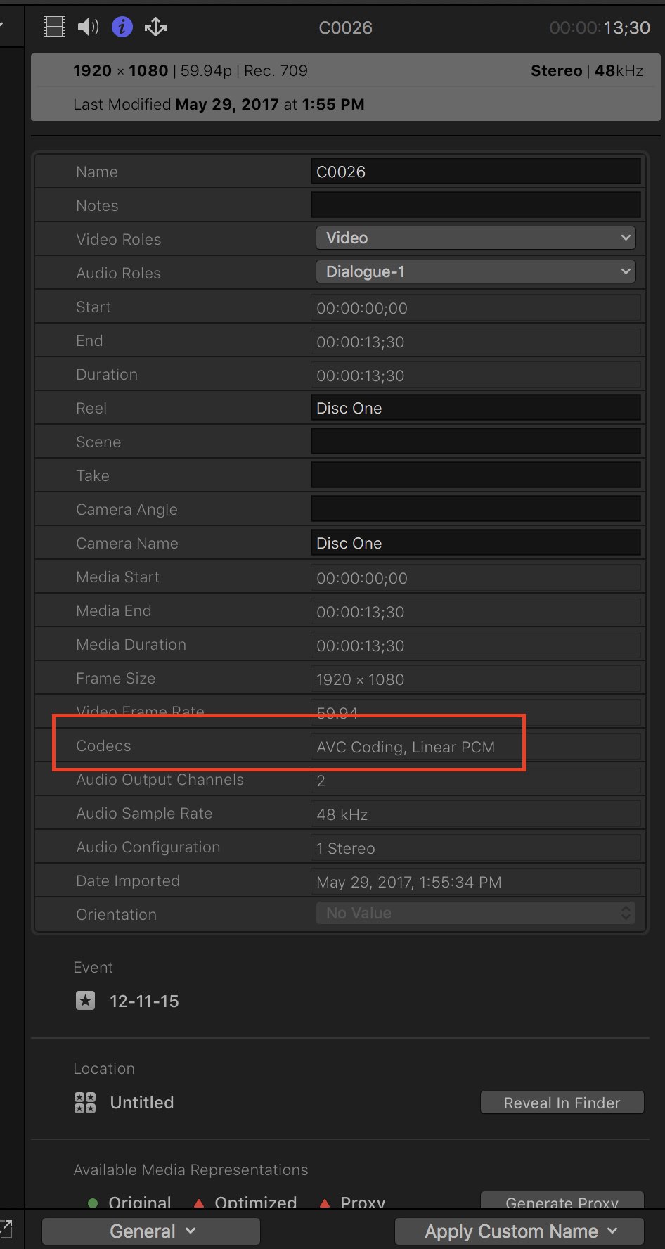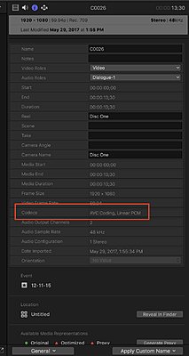 Maybe we're overthinking this. Here's what the Info pane shows on mine once I change the bottom left popup menu to General. In the Codecs line (red box added by me) does it not say AVC coding like this? If it does say AVC, maybe we're worrying for nothing.