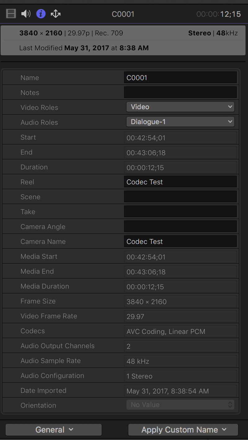 First, I thank you for taking the time in helping me out. I can't tell you enough how much I appreciate it. I do keep my SD card folder intact without breaking it down when importing. My practice is to import directly from my card reader and create an archive. Upon doing so I then save the archived video to a couple external hard drives. The following are a couple screen shots (Huge THANKS to you) for describing how to do it. The first one is my SD card loaded and ready for archiving (named Untitled), with the second one being Info/General. It just seems to me that Apple's (FCPX) software should show the proper codec as it does with the X70. Maybe it's a glitch..... to be corrected. Thanks again and if you have any other thoughts, please let me know. As always, you've been a great help. Ray |
