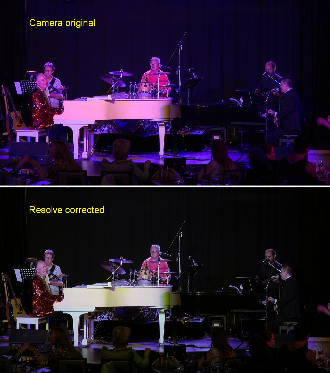 Yes, still doing it. Though every now and again I still get a venue where they will not throw in a white wash, in which case I'm stuck with those horrible over saturated blues, purples, reds etc. If you have cameras with full SMPTE matrix adjustments then you can dial down the over-saturated colors in the Sub-Matrix, that can be a big help. If you don't have that luxury, what I do is go for a preset 4400K balance on each camera and then correct as best I can in post. As per a recent shoot. Sample pix below. If the cameras are the same, once I've got a happy balance, I can then apply that CC to the other cameras. The technique I use to correct is shown in the following YT clip.