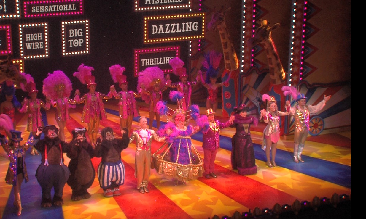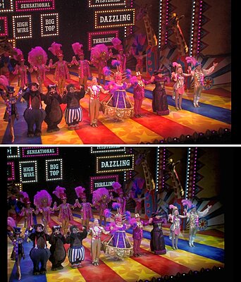 I attached the same show, mostly same costumes, different venue to make the point. In this example, I have no idea if the colours the camera recorded are real, as I did not take the shot. The one I posted is as far as I can get, the same colour as it really was. I'm very interested in what the software can do - but in this case, the result is not in any shape or form, what was created - it's a reimagining. It never looked like that in real life. White balance is pointless when white did not exist in the original. For this kind of show, maybe pink/magenta balancing would be better - but theatrically, white is a seldom used colour. In plays or meetings, or stage use that's being televised like maybe a politician delivering a speech - then it will be white. It's not supposed to be pretty, so then real white, and correction as in your example, is excellent and quite correct. It's just inappropriate for entertainment. It's been a long time now since white light sources were all over the stage, they've always been tints - blues, pinks, ambers. Oddly - I do get the occasional request for face light for some entertainment shows, and if we are short on gear, we will rig some Source 4's over the audience, in open white. Followspots are the other white source, and these do need balancing, but usually that shifts magenta to a purply-pink, and makes blue look a bit odd, but a pink or blue tinged face looks bad in this context. Luckily, for musicals, face lighting will usually be tints again, so in that case, pink is correct - and correcting it, wrong. I did have to jump in once in a production meeting when a Lighting Designer was being judged based on a show video and I had to point out that in the theatre, it was extremely likely the colours were much more vibrant and punchy and not the kind in the still I attached here. We have learned to never judge the lighting by photos, unless the person who took them understood theatre. My role is not really to take video and photos, but it got added to my job when my results met Directors approval and a hired in video team didn't;t get it at all. When you take 1.5 million at the box office, you want pictures that look like what people see. We now have many photographers who take pictures all over the country who do understand the importance of pink! Is the floor yellow or orange against the red? In white light it IS yellow, but not when the light landing on it is pinks and magentas. |