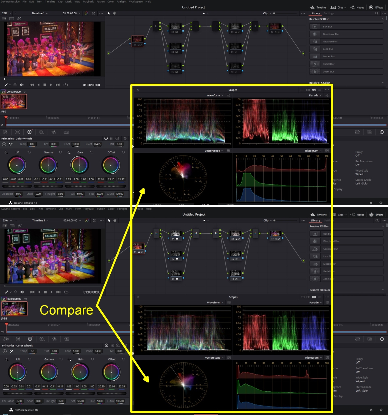 As you can see from the scopes, parades, vectors etc that the lighting has thrown everything out of whack. Even out of camera, a 709 image can be corrected for white balance quite easily. Here I use two splitter combiner nodes with a standard node either end. This took about a minute. This is what I do for each song in these sorts of scenarios. I create a Gallery still, which when applied to a clip opens up the nodes for fine-tuning if necessary. Not saying the sample is perfect by any means, but it gives you an idea of what can be done. Chris Young |