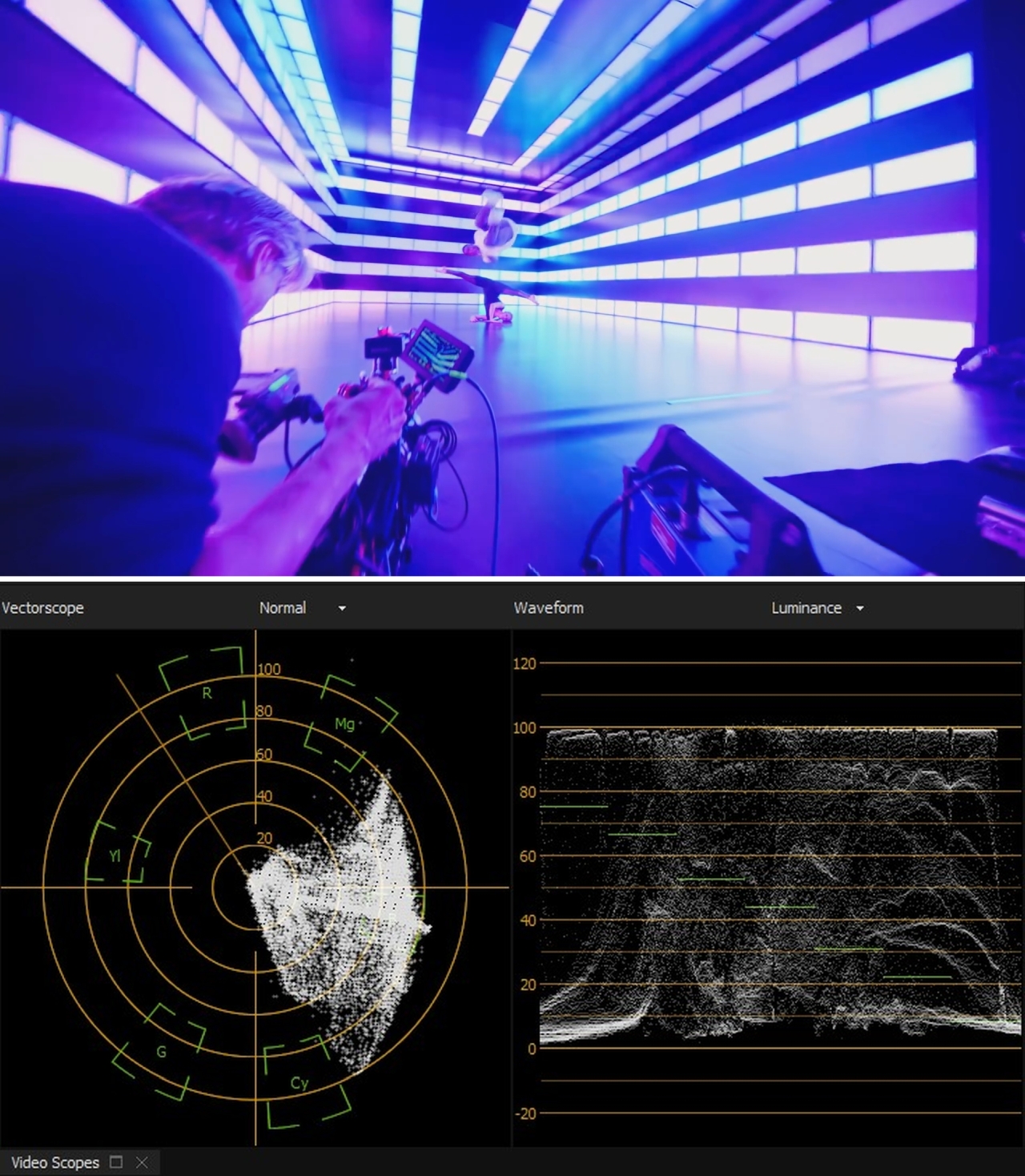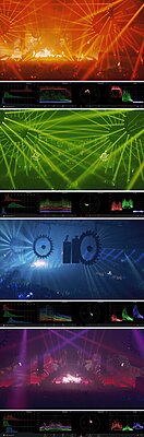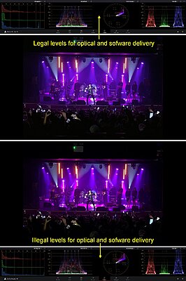 You are producing video. A video reproduction of a stage show. As video producers go, isn't it our responsibility to span the gap between the live show and distribution media? Whether it's one DVD or thousands. Yes it is our responsibility. Going outside the DVD standards produces overly saturated images that overload the image processing circuits of the DVD player or TV if it has a built-in DVD player. The same goes for SDR BD discs. Would you ever master audio CD's with massive distortion? That sounds terrible on playback? The answer is no... one would hope not. No need to do it in either on the video or audio on your DVDs? Distorted video levels whilst not as painful as distorted audio levels are still distorted. So why not pay the same attention to the video component of a production and minimize the video distortion introduced during the recording session. If the venue you are shooting in doesn't light for video, then it's up to you the producer to ensure that your post-production takes that into account when processing the signal. Just as you would a massive dynamic range outdoor shoot. Manufactures know the limits of their camera technology and are always striving to increase the dynamic range so that it can be brought into the existing 6 stop 709 standard, which we are stuck with. Until everyone goes HDR 2020 with it's up to 15 stop range, we as video producers have to coax whatever we record into the existing standard forced on us by that thing sitting in our lounge rooms, the TV. Or forced on us by the video players on our PCs which are expecting 709 video levels. This is why such techniques as photo stacking is used to capture more dynamic range into the limiting 709 space. It's an imperfect world. But if in the course of our production work we don't adhere to the standards set for video delivery, we are not doing a very good job of it as "professionals." We are no better than a sloppy plumber or electrician. Everyone will do as they wish and see fit, but I will never employ a video editor who doesn't work to the standards set by the industry. Well, that's not strictly true. One of the best editors I ever employed to produce TV shows was visually one of the most artistic I've ever seen. Standards? He didn't even know what time code was used for on multi-camera synchronization. But once he learnt the technical side and the standards to work to, he became a maestro. He is now one of the top editors at Channel 10 in Sydney, entrusted with some of their biggest budget productions. Until we reach the point where cameras can process light, its range and color like the Mark 1 human eyeball, the best optical device so far, photographers will struggle with photo stacking and us videographers will struggle with cameras where the current technology cannot cope with the lighting ranges we encounter whether it's daylight or artificial light or a combination of both. Hence, the development of LOG and RAW recording to be able to capture greater range. This massive light show, link below, was not at all impacted at all visually for the attendees, or those watching the live stream on TVs or PCs by having to work within legal levels. Really there is no excuse not to do so. Just saves so much time, money and drama. And in the long run with the added bonus of no colors looking horrendous to assault your eyes. Look at the level grabs below. My last words, as I'm becoming far too boring. I guess what I'm trying to say is that sadly though, whatever we capture with, using LOG, RAW or the humble old 709 encode we have to massage it into the existing standards if we want it to look as good as it can get. Chris Young |