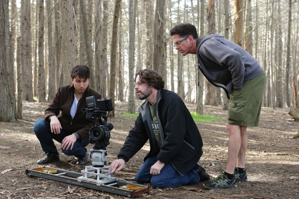The setup for the first shot, seen above. Left to right: camera assistant Ted Allen, me, Devin Baker. Slider courtesy of Shooting Star Video.