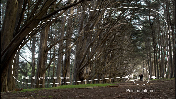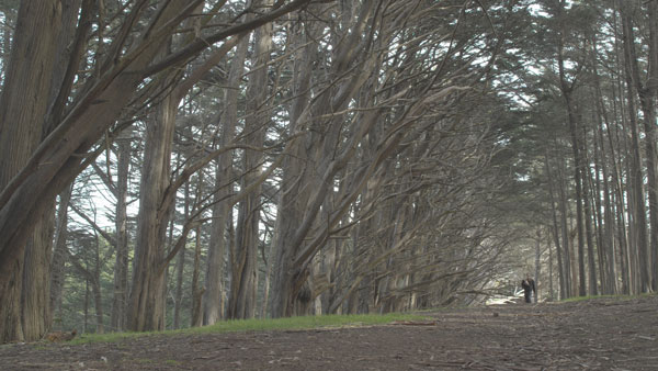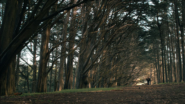 The first shot is the most painterly. It looks down the cypress grove at an individual walking up a path as the camera slowly slides left to right. I opted for a low angle for two reasons: