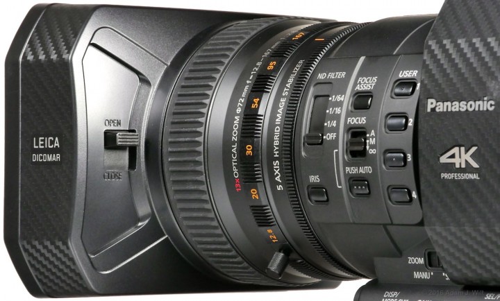 The Leica-certified 13x lens sits behind a large, carbon-fiber-look lens hood. Pop the hood off, and you’ve got a 72mm filter thread.