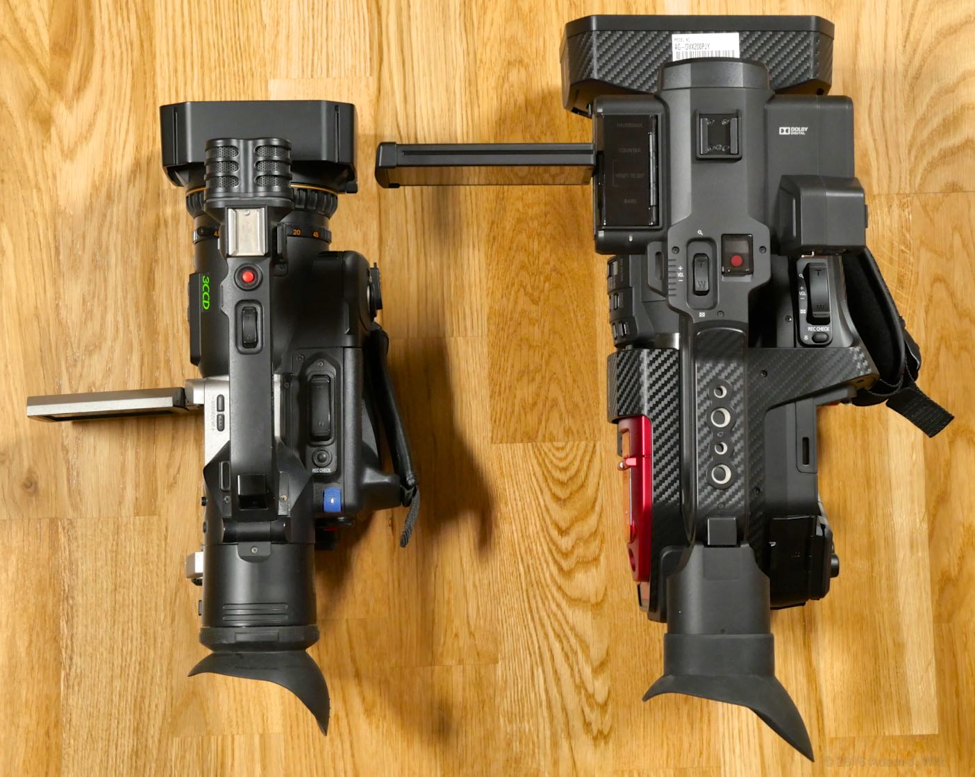 Surprisingly it’s about the same height and only 3/4” wider than the AG-AC160 and HPX250 1/3” HD camcorders, and is nearly three inches shorter; its stubby proportions and bright coloration make it look more portly than it is.
