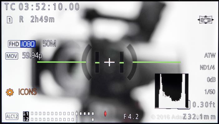 If ‘scopes aren’t your thing, the DVX200 also has spotmetering built in: it’ll report the brightness in percent of a box in the middle of the picture.