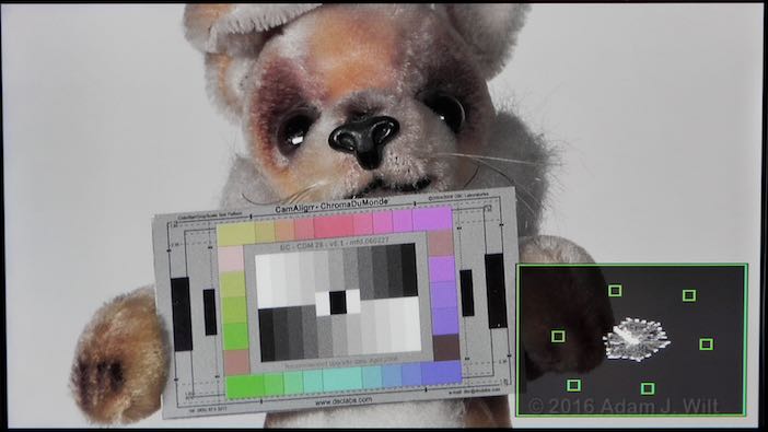 The histogram updates fairly slowly, taking nearly a second to fully refresh. Unfortunately it overlays the macro and focus-mode indicators, just barely visible beneath the histogram’s lower edge (I’m told it can be dragged anywhere else you’d like, but I didn’t think to try this when I had the camera). Pressing the WFM button (normally user-assignable button 7) swaps all the onscreen displays for a realtime waveform monitor or vectorscope: