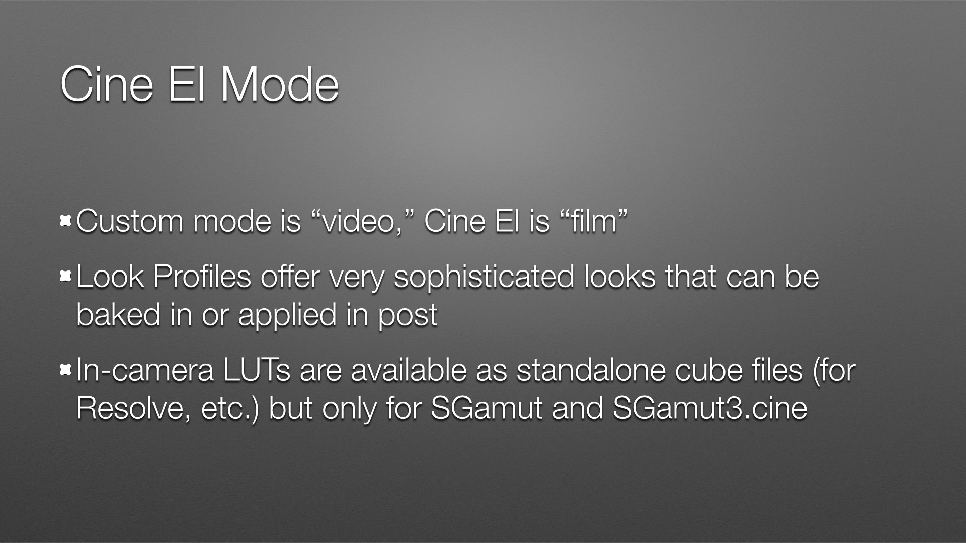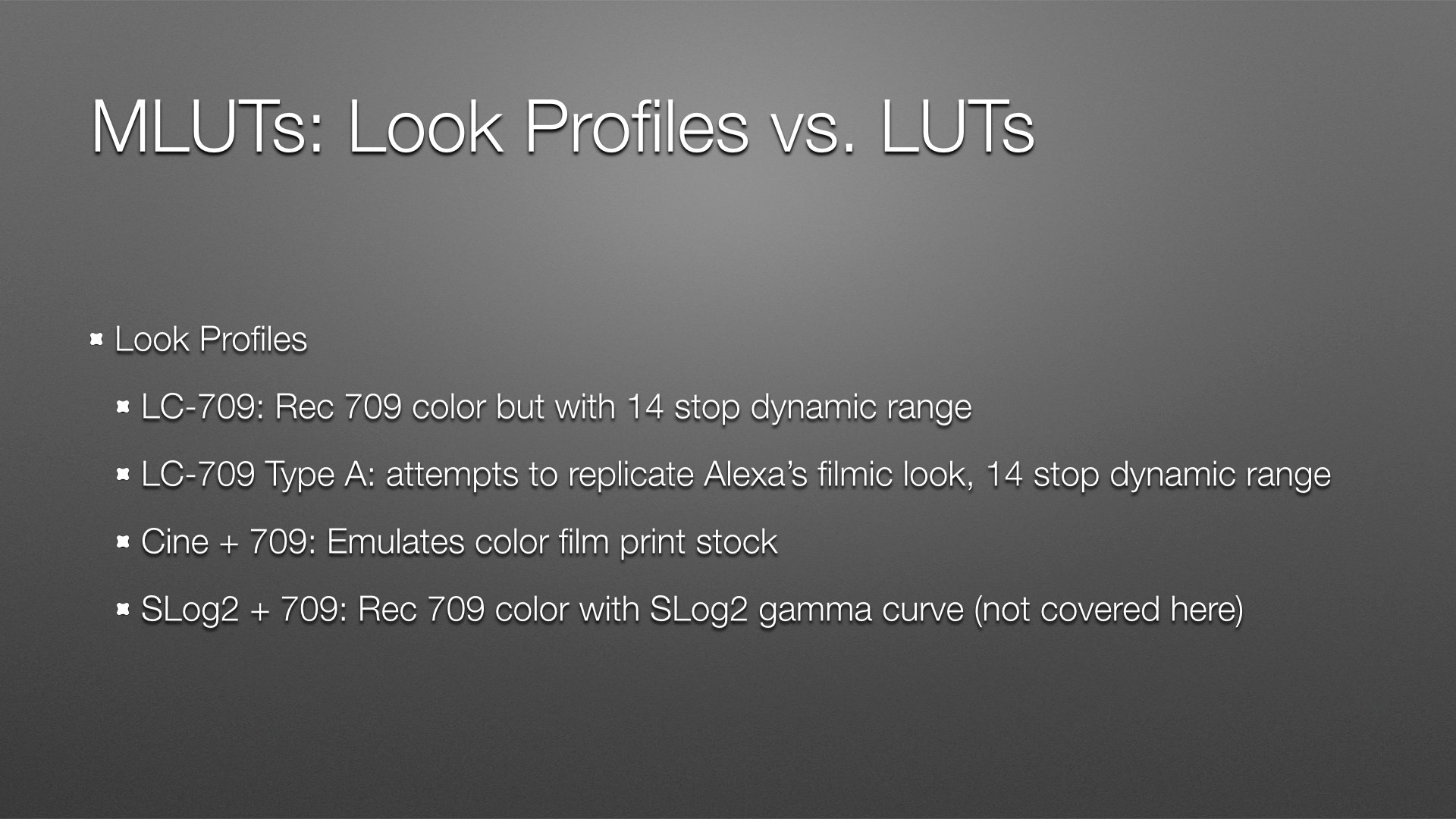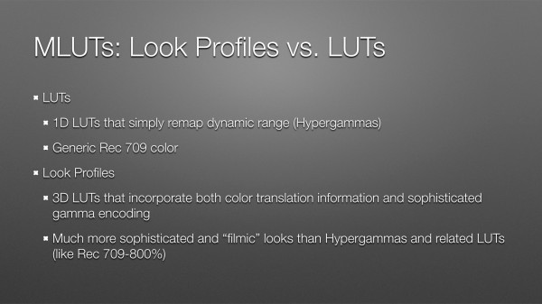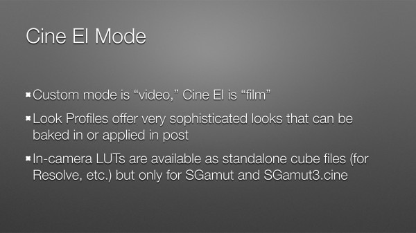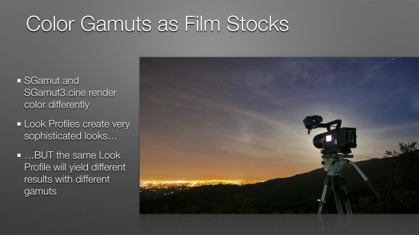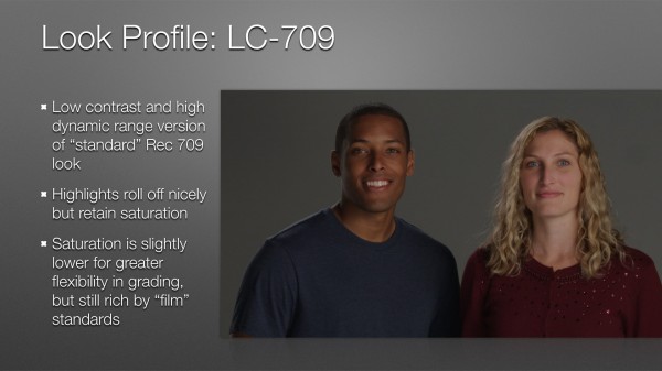The slide really says it all: LC-709 is a “normal” Rec 709 look built into a 3D LUT. Sony decided to reduce saturation in this LUT to make it harder to clip colors, which makes color grading easier. You can always boost what you have, but you can’t restore what you’ve clipped.