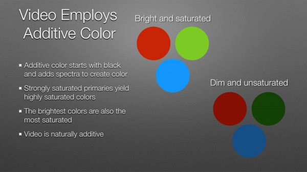 Video is naturally an additive color system, and video manufacturers have always played to this strength. The result of this is the “video look,” where saturation increases with exposure until a color channel clips.