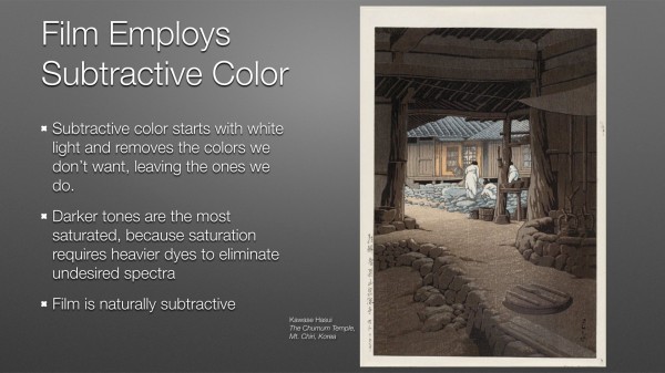 Film is naturally a subtractive color system. It starts with white light pushing its way through a film base, and dyes embedded in the film block portions of the white light spectrum in order to pass only the spectra relevant to that portion of the picture. It’s very similar to watercolor painting, where the artist starts with a white sheet of paper and adds dyes to it until the white light bouncing off the paper is reduced to a smaller portion of the color spectrum to create a specific hue and value.