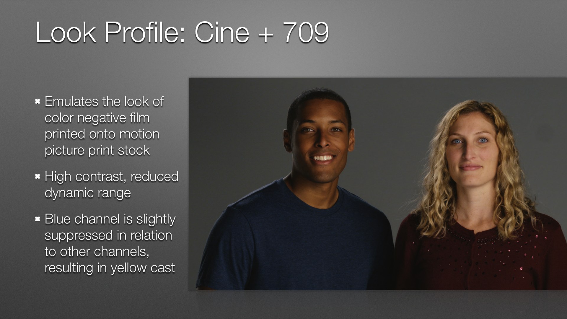 LC-709 is a bit desaturated compared to Rec 709 800% and rolls off highlights in a much gentler curve. In the slide above, William’s face is less oversaturated orange than Rec 709 800% and Kelly’s face looks bright but not overexposed and on the edge of clipping.