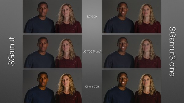 This is a great comparison of SGamut and SGamut3.cine, and a demonstration of how the underlying characteristics of your chosen color gamut always affects the LUT you impose on it. For example, SGamut makes William’s face seem redder than it really is, and it exaggerates the red in Kelly’s face as well as making her appear yellowish in Cine + 709. SGamut3.cine always renders flesh tones more neutral and less red, even in Cine + 709 where warm tones are deliberately emphasized by the yellow cast.