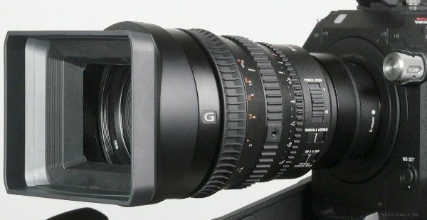 The iris ring is marked in third-stop increments, and a slide switch on the right side of the lens enables or disables click-stops at those increments. The scale runs from f/4 to f/22 over a 90º rotation, and beyond f/4 there’s an “A” setting for auto-iris. Another slide switch locks the ring in either the manual or the “A” positions, so you won’t inadvertently move between ‘em – if you leave the switch in the unlocked position, it’s very easy to move from f/4 to A and back again. In the A position, auto/manual iris selection is done on the camera; you can set up the FS7 to use the IRIS dial, the SmartGrip dial, or both to select an aperture.