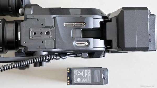 It’s set up to carry a V-mount battery. The extension unit plugs into the top of the FS7 once a pop-off plastic cover is removed, but it also has a bulgy bit that slots into the FS7’s battery well, so that the oversized BP-U60T battery I was supplied with has to be removed first. A smaller battery, like the stock BP-U30, might still fit, but you’d have to remove the expansion unit to change the battery out, and I don’t know if the internal battery can power the FS7 with the extension unit installed. I suspect it’ll be disabled, but that’s just a guess.