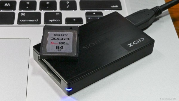 An XQD card is a bit larger all around than an SD card, and about twice as thick. Its contact pads are inside three slots in the end of the card, not exposed like an SD card’s are. The card rattles slightly when shaken, and it has a heavy feel to it. It reminds me of the AXSM “memory slabs” used in the R5 recorder shrunken down to SD card size.