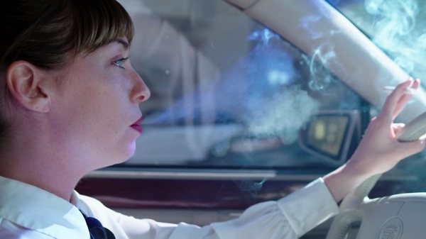This backlit approach worked particularly well when shooting shots with a lit cigarette as the smoke stood out very nicely from the background. We rolled down the windows between takes to let the smoke out but couldn’t leave them down while shooting as car windows tend to have a green tint to them. Leaving them all up meant that I could pull some green out overall during the grade and bring the image back to normal, but leaving one window down would mean that any light coming into the car without passing through green glass would turn magenta. As I graded this project myself, and as I’m not that great a colorist, I opted to breath in a lot more cigarette smoke than I usually would so as not to deal with the headache of trying to key subtle hues of magenta and grading them back to neutral.