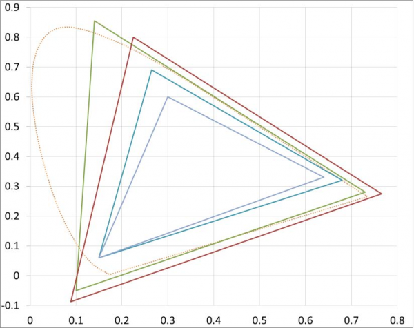Legend: SGamut3 (green) SGamut3.cine (red) P3 (cyan) Rec 709 (blue)