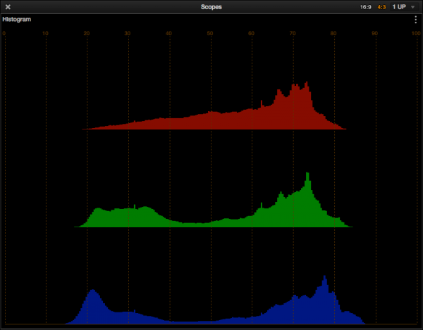 This is a normal histogram, pulled from Resolve 10. Histograms count pixels, nothing more, and they only tell us how many pixels in an image fall into a specific brightness range. Black is at the far left; white is at the far right. Brightness increases from left to right, and the more pixels  that fall into a brightness range the taller the peaks will be.