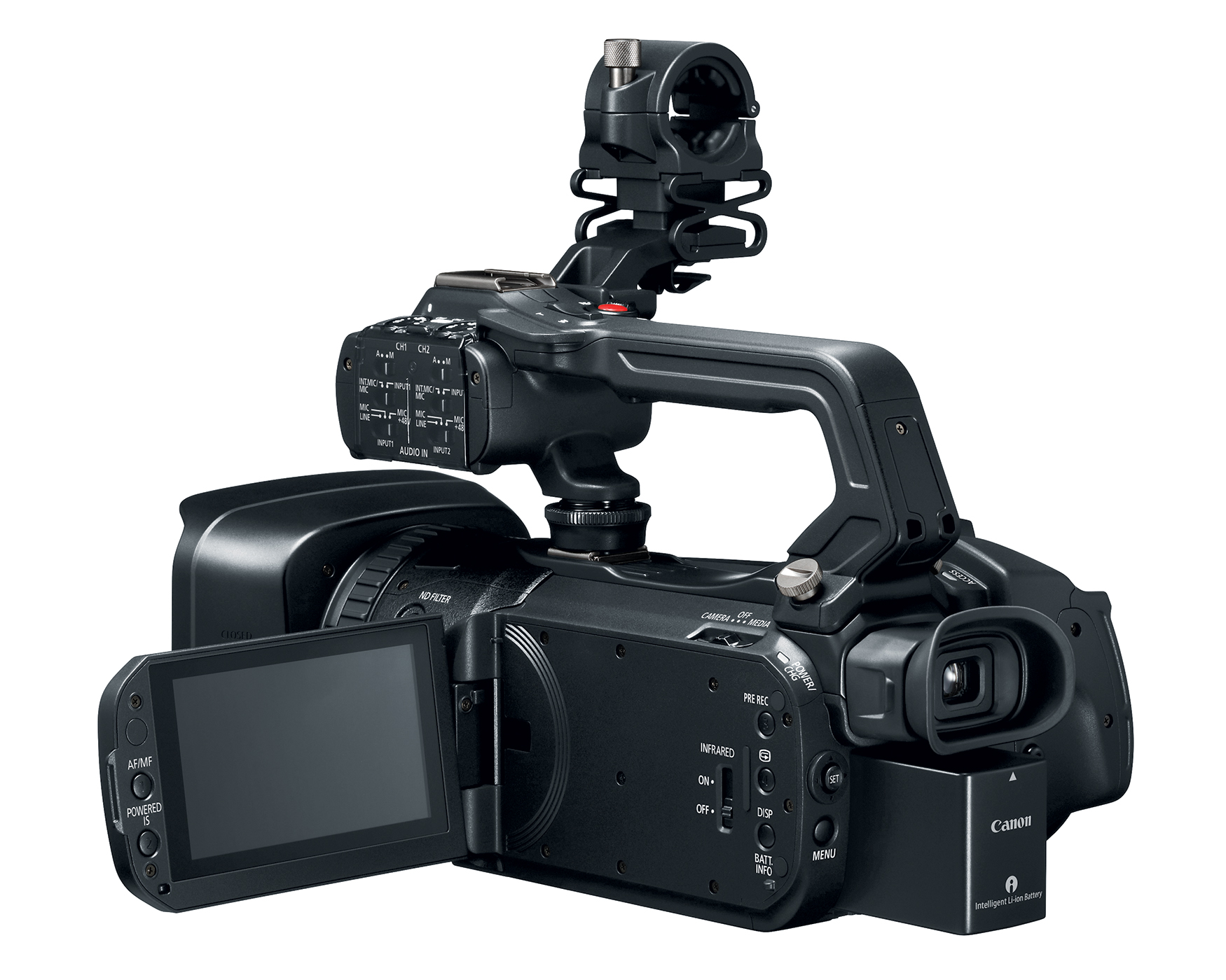 All Canon XF series camcorders include selectable Neutral Density filters, vectorscope, waveform monitor, focus assist, 2-channel 16-bit 48 kHz audio recording, two XLR audio input jacks, HDMI output, headphone jack, USB Mini-B, LANC remote jack, built-in stereo microphone and a removable external mic clamp. All include two primary flash card slots for dual recording or relay recording purposes.