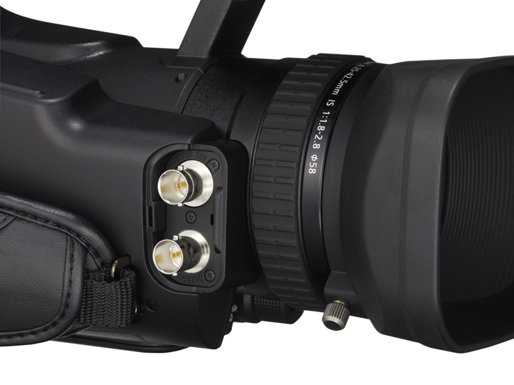 The compact XF100 and XF105 are the smallest and lightest of the XF series, and also have the shortest zoom range. They record Full HD at 50 Mbps in the MXF file format to two Compact Flash cards. An SD card slot is used for moving image profile settings between cameras. These camcorders have one control ring on the lens barrel which can be assigned to either zoom, focus or iris. There are ten assignable buttons and a customizable control dial. The XF105 adds two jacks, for 3G-SDI and GenLock.