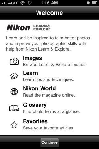 Recently Nikon has taken their content to a platform that’s a little more convenient, namely the iPhone and iPod Touch, with their Nikon Learn & Explore – photo tips, techniques and terms app. While this app doesn’t remotely control cameras or let you browse your photos in some special way (why would it?), it’s a goldmine of information.