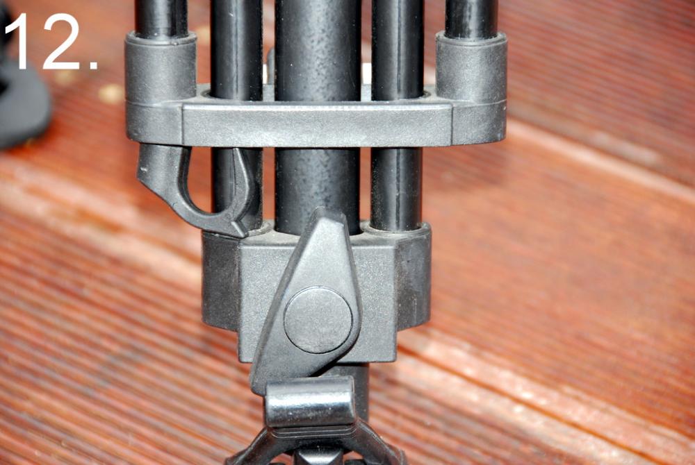Also, the leg lock strap, which is actually a thin, circular cross section bungy cord with a black plastic hook attached to the end, that pulls out of the bottom of one of the centre stage tubes, really doesn’t look man enough for the job long term. I may be wrong, time will tell (photo 10.).