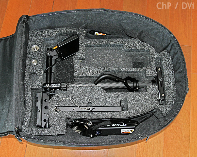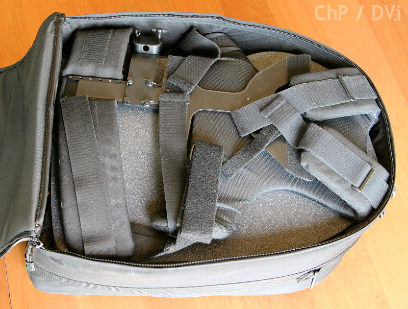 But as anyone who has handled even the feather-light Merlin for periods of time can tell you, a handheld stabilizer takes its toll on the “meat-based” support system that it relies upon, namely the operator’s own forearm. The logical next step was to further miniaturize the Flyer arm and vest for use with the Merlin, which relieved the burden while still retaining the possibility of handheld use. Building on that, Tiffen surprised everyone with the introduction of the Pilot, an “in-between” Steadicam which used the same arm and vest as the Merlin but with a beautiful new sled design and an attractive price point.The first time I saw the Pilot, I thought, “Now that makes a lot of sense.” The skinny center post of the Flyer had been re-imagined in carbon fiber and widened for an improved handgrip; the battery and monitor were mounted on an adjustable horizontal post allowing each to be independently positioned, allowing for more flexibility in balancing than the Flyer’s lower section. The 10-pound capacity would neatly encompass all of the 3-chip cameras on the market even with the usual accessories onboard. And the option to add the Merlin weights as inertial supplements at the outer corners of the rig was a stroke of genius.