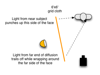 I know a lot of DPs and gaffers who like to back large sources away from the talent, and I get why that can be useful: if the source is too close then the actor’s exposure is going to change dramatically if they move too far toward it or away from it. If I know the actor isn’t going to shift position much I like to get it as close as possible as I get much softer highlight-to-shadow transitions, plus I get more contrast in the wrap around the face. If the source is close to the side of the actor’s face then that area will get more light, while the far edge that extends toward the camera contributes less light to the front of the face. This exaggerates the effect of the light as it wraps around the face as the side of the face is brighter than the front, and then the light softly trails off into shadow on the fill side.