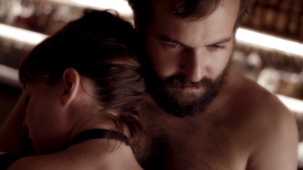 I rigged two light sources for this wide shot. One, behind the bar, was my 6’x6’ grid cloth clipped to the front of some refrigerators that ran along the back of the bar. We punched our 1k open face light into it to cast some soft low backlight onto the actors that would turn into sidelight when we came around for closeups. We also smacked a 650w fresnel into a white wall at the end of the bar facing the actress to give her a nice big soft key. We shot at very low light levels, dialing the F55 up to ISO 2500 or so and shooting at T2 to get the proper look.