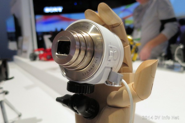 This is the nifty little Sony CyberShot QX10, billed as an add-on lens for your smartphone but it also functions as a stand-alone camcorder with a built-in Micro SDXC card, which you can remotely monitor with your smartphone.