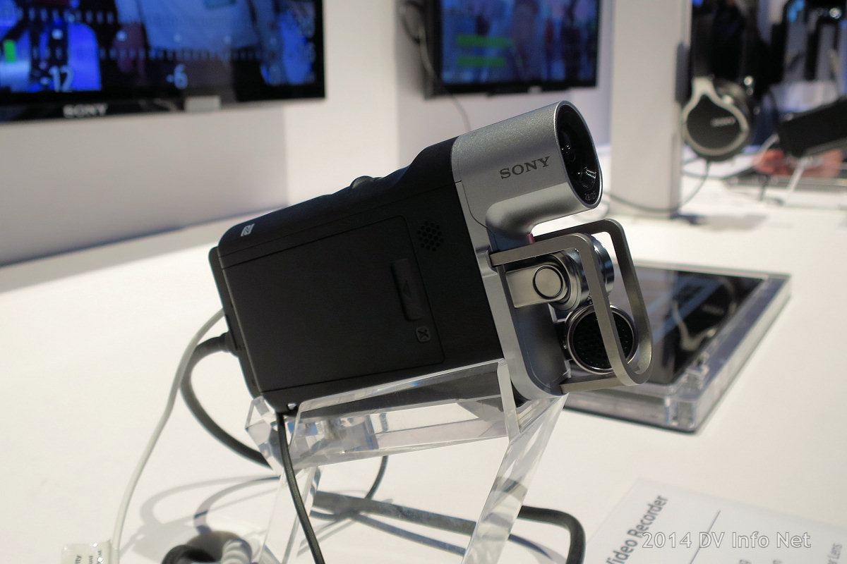 Here’s the Sony HDR-MV1. Sony calls it a “music video recorder.” It has a fixed Carl Zeiss Tessar lens with a 120 degree field of view, and a 120 degree X-Y position stereo microphone. Memory Stick Micro and Micro SDXC recording.