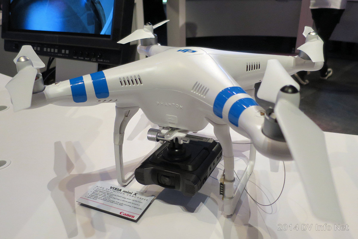This is the first time I’ve ever seen a quad copter in a Canon trade show booth. That’s the DJI Phantom 2 with the newly announced VIXIA Mini X personal HD camcorder slung below it.