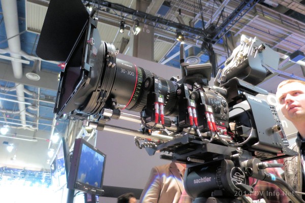 More shades of NAB. Canon brings the heavy iron to the Consumer Electronics Show. This is the Canon EOS C500 4K Cinema Camera, all decked out on a sled, with a Canon CN-E 30-300mm Cinema Zoom Lens to pave the way ahead.