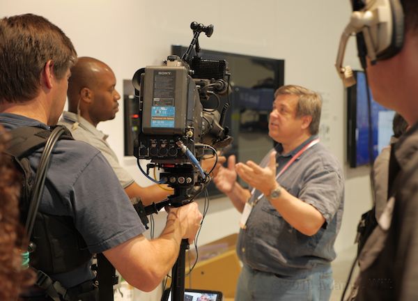 Sony’s Gary Mandle, Maestro of Monitors, gives an interview to a roaming Sony Steadicam, during booth setup on Saturday afternoon: